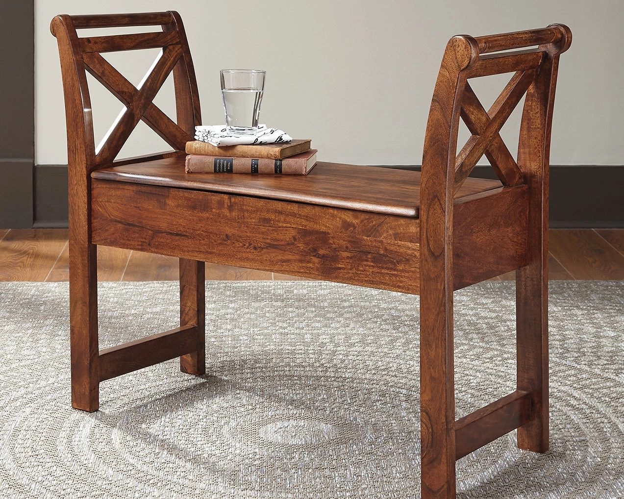 This bench is the perfect addition for any room that needs a little extra seating. Beautiful brown color and X-design on the sides give the right amount of style to this sturdy piece. Need to put away a few things? Lift the seat top to reveal storage.