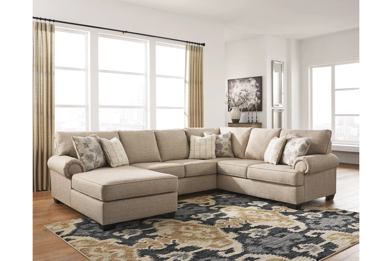 Lighten things up in a comfortably chic way with this 3-piece sectional in βhempβ beige. Traditional elements such as t-cushion styling and prominent piping are modified with slanted roll arms for a beautiful balance of classic and contemporary. Linen-weave textural fabric is paired with posh designer pillows that truly perfect the look.