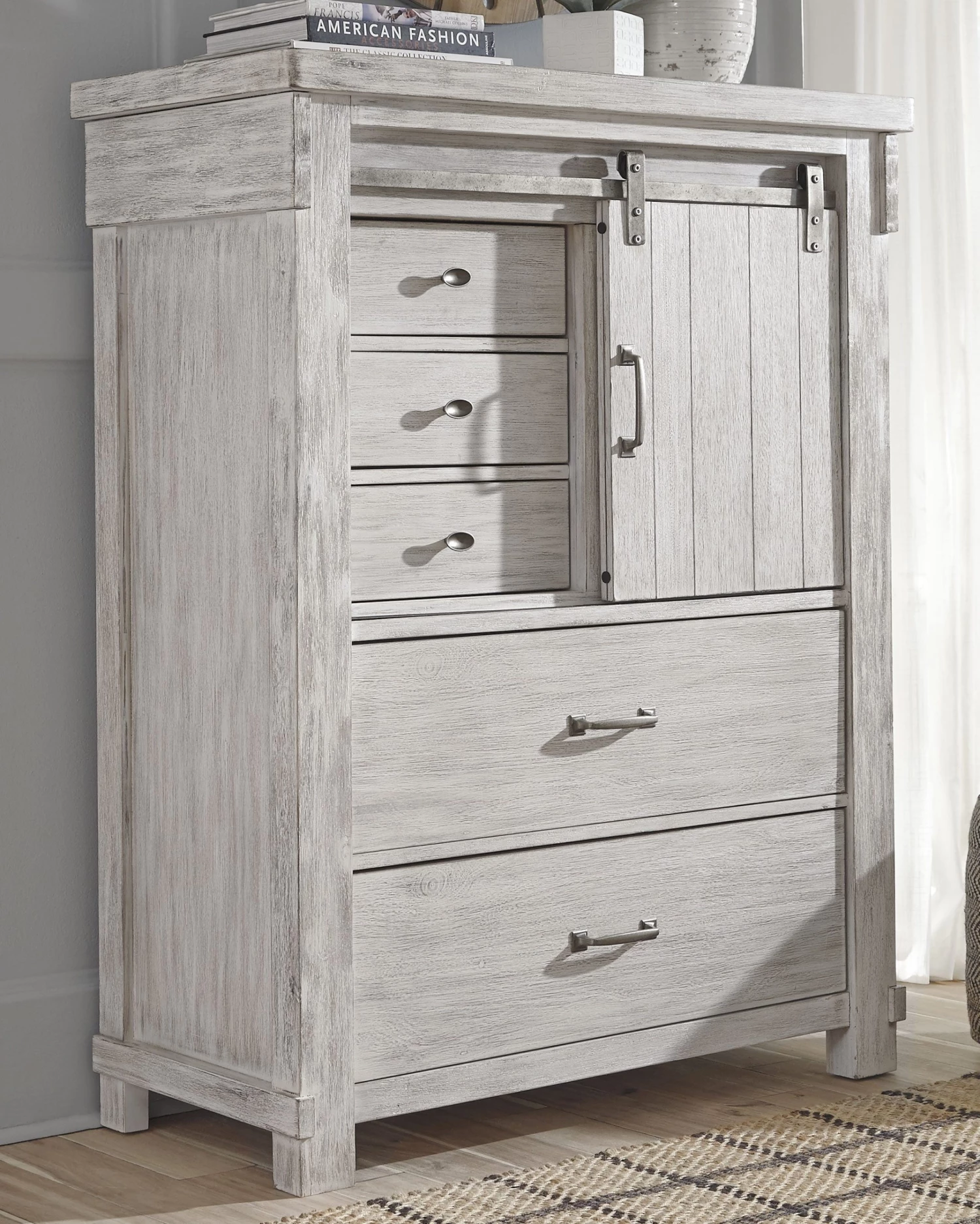 This chest of drawers brings a fresh twist to the modern farmhouse movement. Handsome, hearty profile is made all the more interesting with a sliding barn door revealing shelved storage. Through-tenon styling incorporates a welcome touch of American craftsman. And the easy on the eyes, distressed white finish? Just the tone for a soothing, serene bedroom retreat.