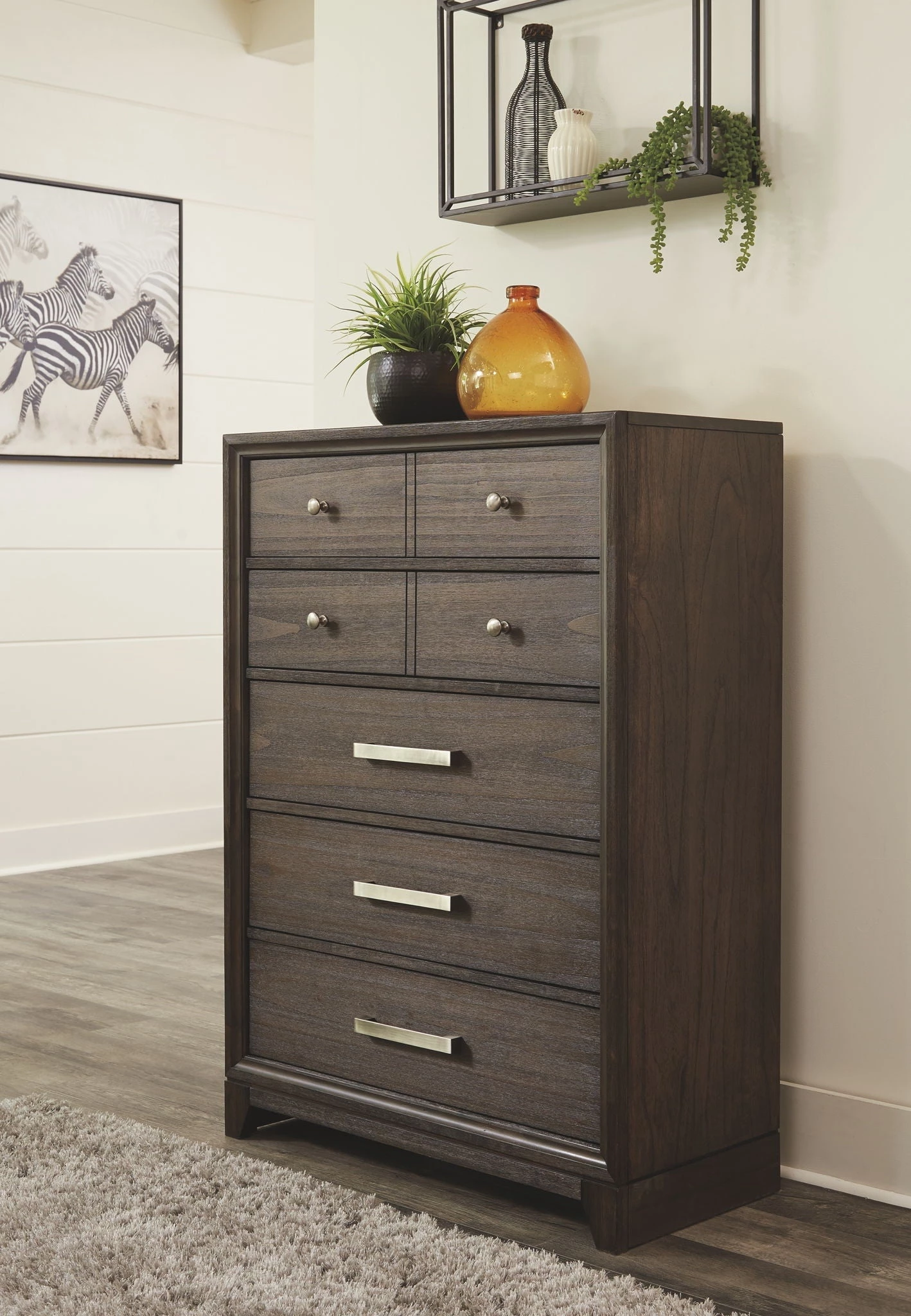 Satisfying your taste for transitional contemporary furniture, this chest of drawers sports serene sophistication. A wonderfully clean-lined profile is dramatically enriched with a complex, burnished finish and brushed nickel-tone hardware. Five roomy drawers keep your wardrobe organized in style.