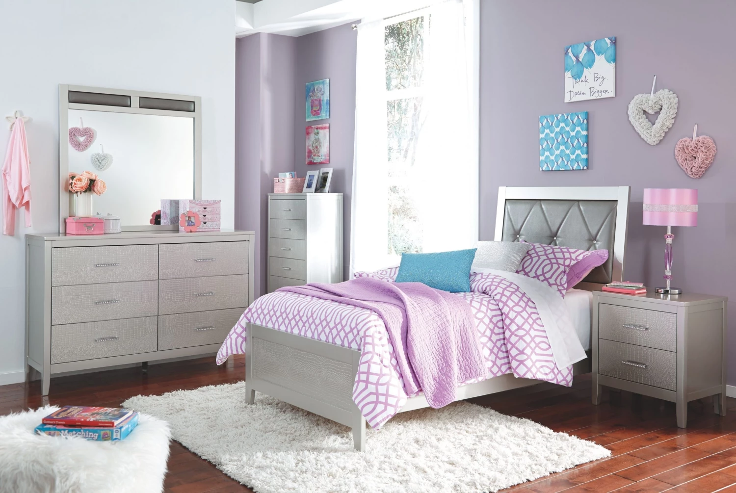 Made with paint grade materials and hardwood solids finished with a metallic silver color. Embossed textural drawer fronts and footboard panel have a modern “Glam” look. Headboard panel features diamond tufted gray faux leather cover with crystal look buttons. Metal center guide drawers with paper wrapped boxes. Bar pulls with inset faux crystal arrangement. Mirror has decorative upholstered insert with gray faux leather cover. Twin and full panel bed is made with paint grade materials and hardwood solids finished with a metallic silver color. Footboard has embossed textural panel within a simple frame and tapered leg. Headboard panel features diamond tufted gray faux leather cover with crystal look buttons. Fully upholstered bed is offered in twin and full sizes and has box stitching and shallow tufting effect with crystal look buttons and delivers in one box.