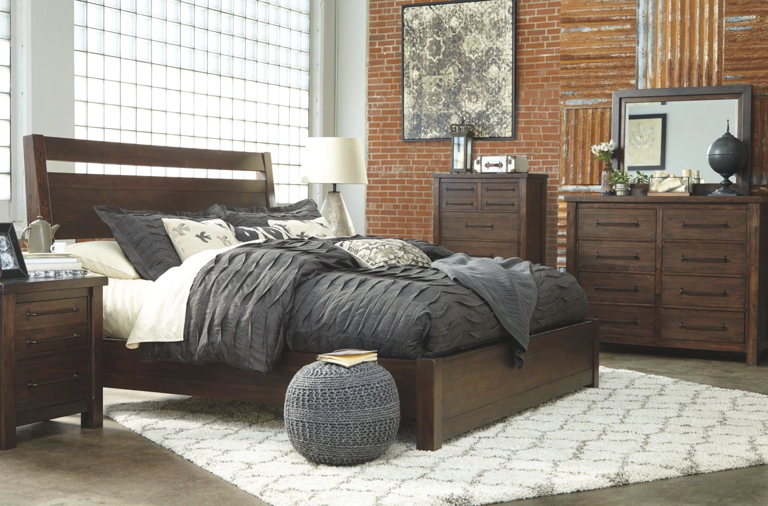 This bedroom is made with Acacia solids and veneers throughout rendered in an oiled walnut coloration for a deep woody finish. Night stand top features a solid wood framed top with an inset of composite cement. Night stand features an AC power supply with (2) USB charging ports. Drawer boxes are French/English dovetailed and fully finished with metal ball bearing side glides for smooth function. Case design has framed thick tops and posts and drawers feature an industrial looking metal bar pull that adds a bit of Urban flare to this collection. Bed has a lay-back headboard design with wide plank detailing and lower profile platform looking footboard. Mirror frame has a metallic finish and glass has a beveled profile.