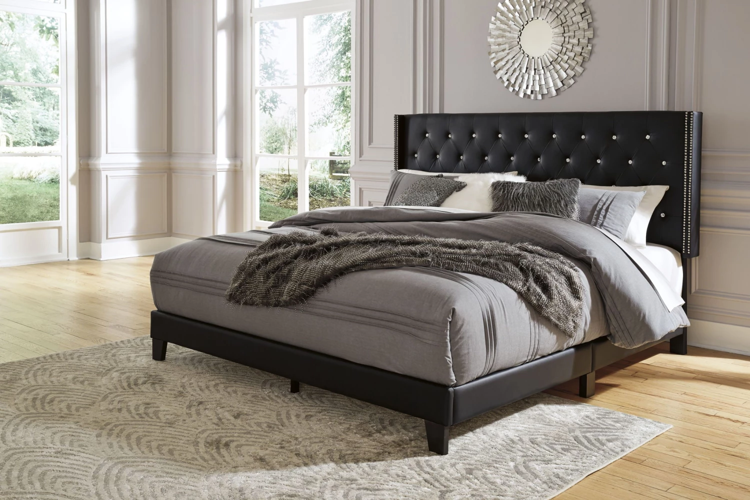 - Button-tufted, wingback headboard with nailhead trim accents
