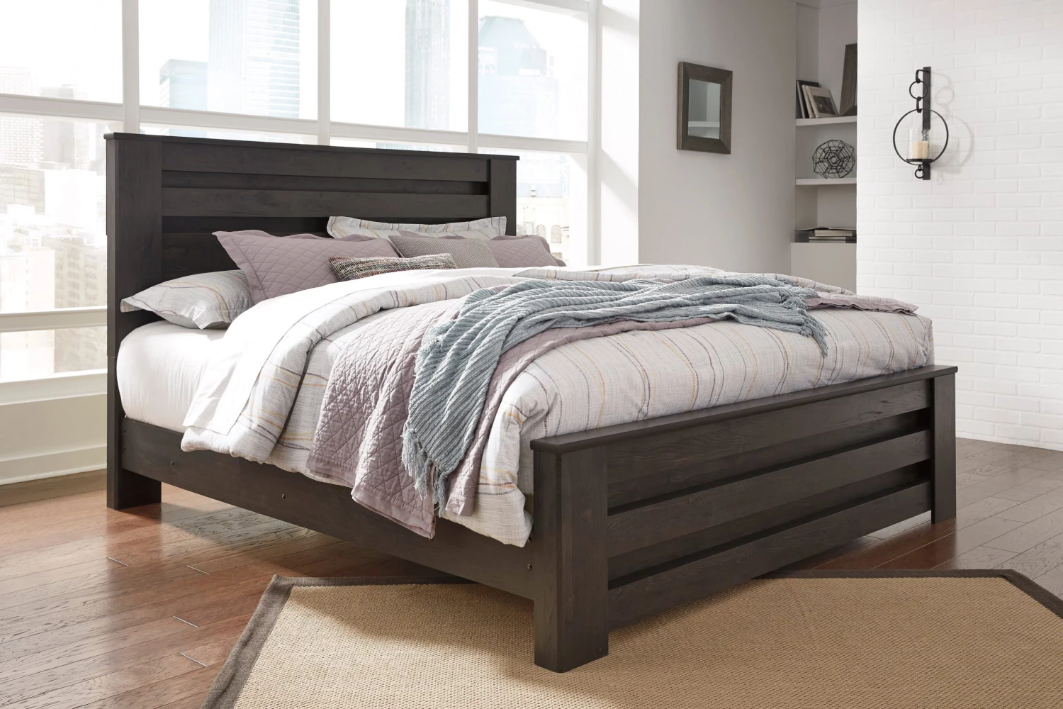 Dark charcoal finish over replicated oak grain. Tall generously scaled cases with wide pilaster. Large dark color handles with an aged appearance accent cases. Modern styled deep panel Bed enhanced with horizontal pocket details.