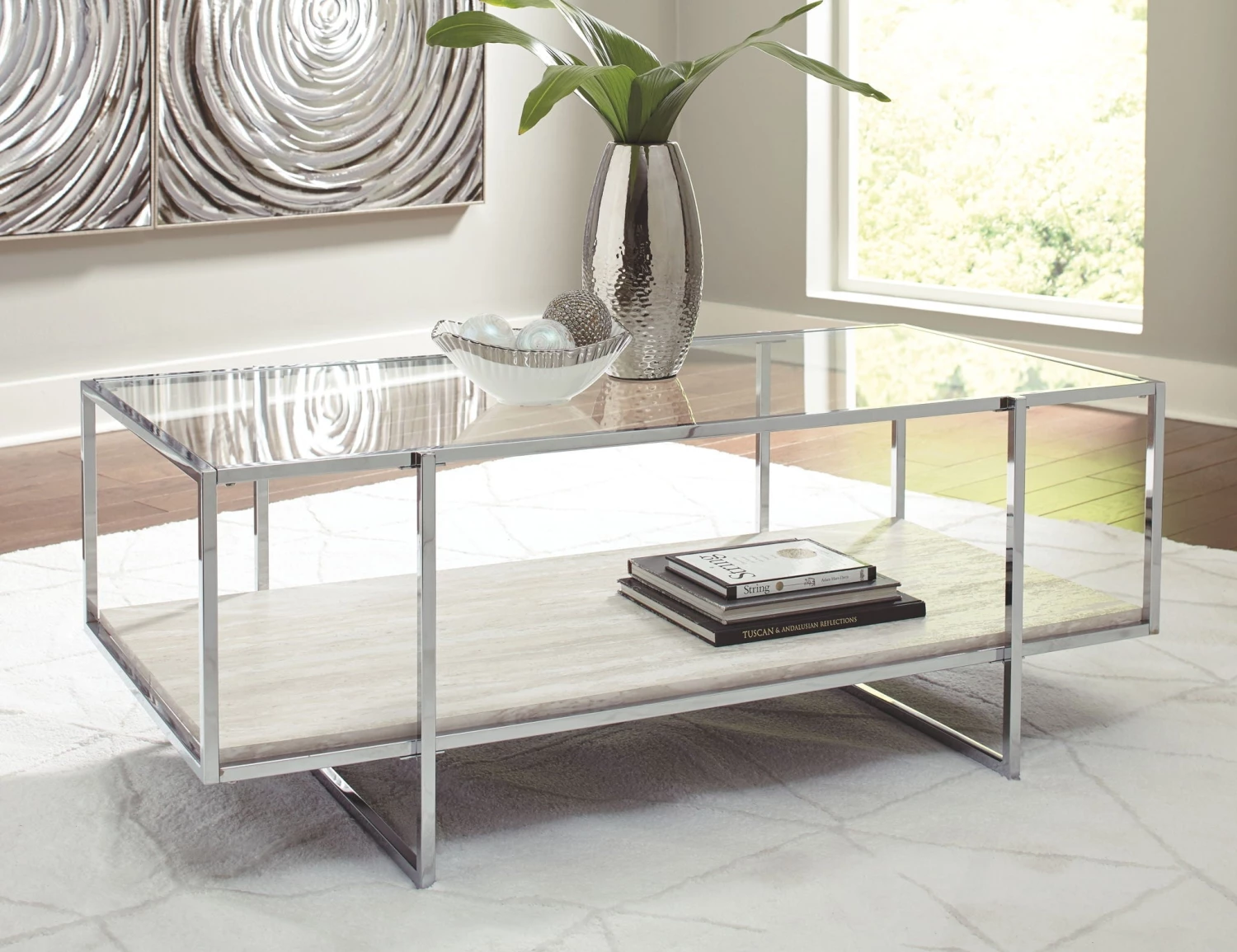 Contemporary style gets a modern attitude in this cocktail table. A tempered glass top showcases the replicated travertine stone shelf. The box design of the metal frame creates open space to offer the illusion of more room.