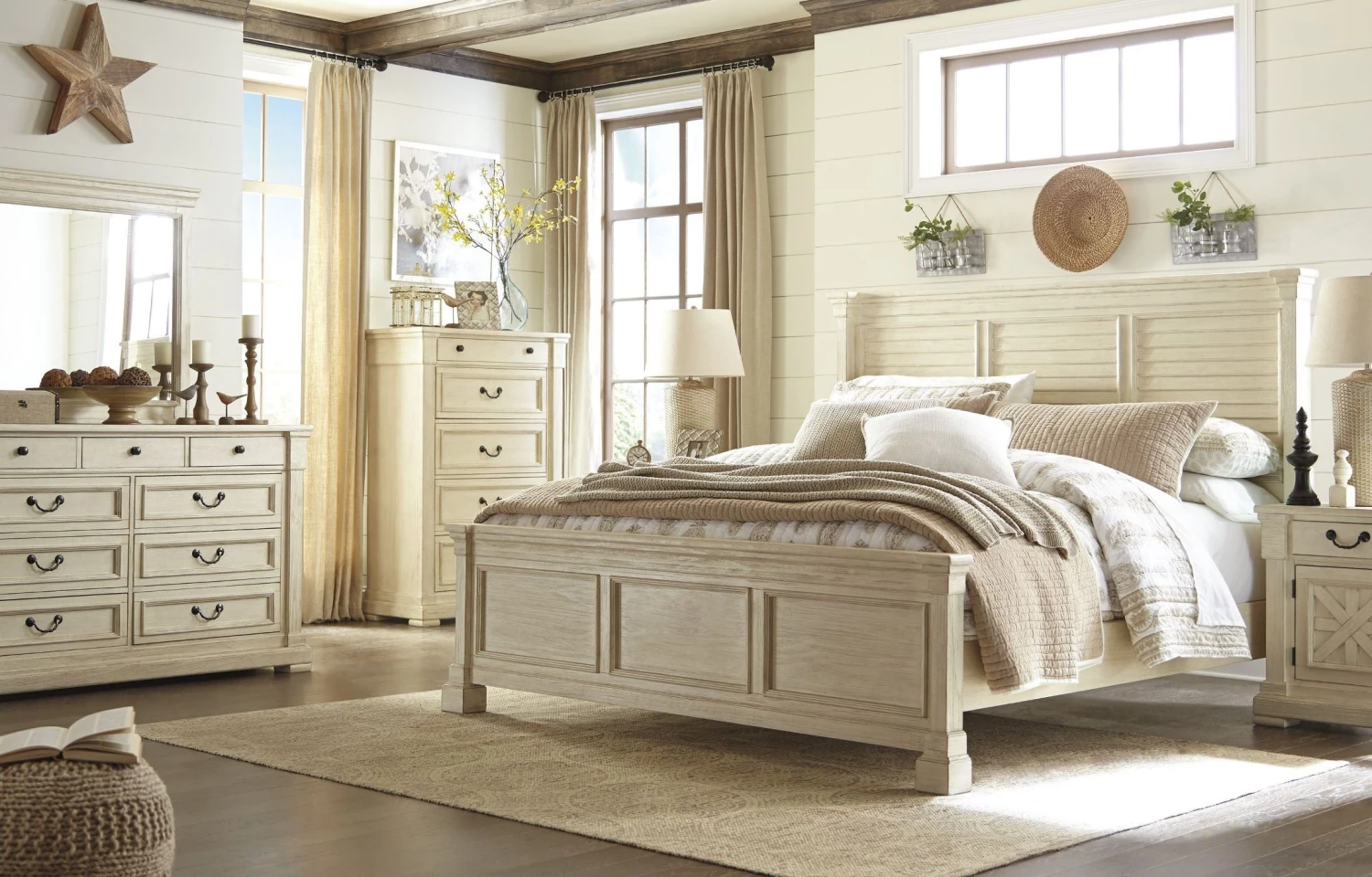 Ashley Bolanburg Antique White King Louvered Bed With Dresser Mirror & Nightstand