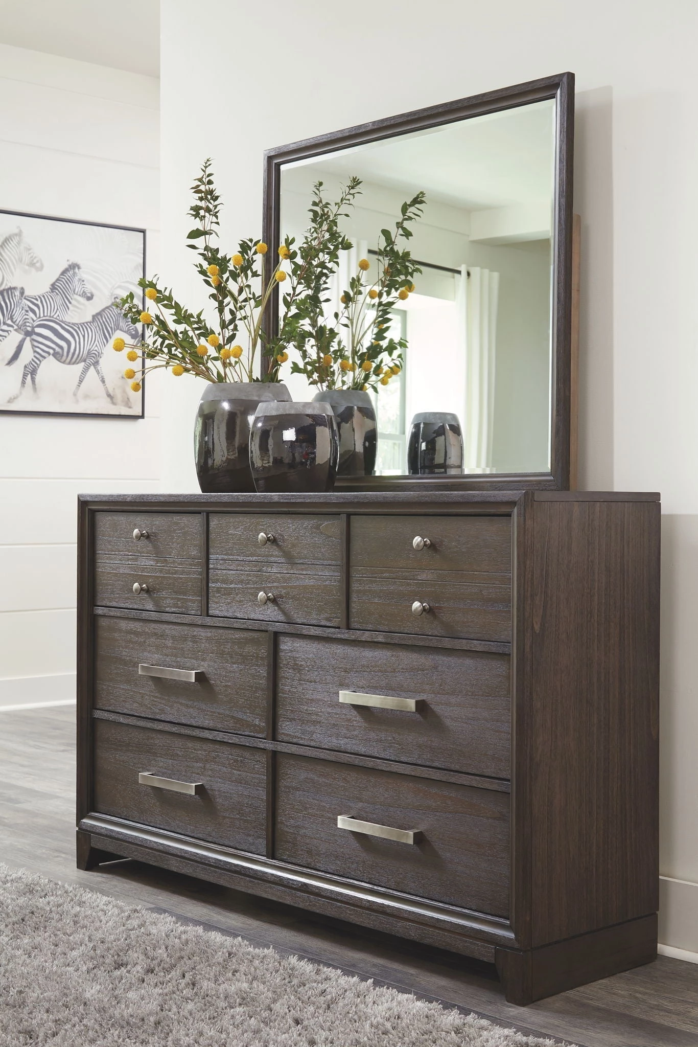 Transitional contemporary styling. Picture framed cases made with hardwood solids Mindi wood veneer and engineered wood substrate. Lay-back headboard design with channeled Upholstered panel. Fabric is a textured grayish white polyester weave. Two drawers in the Footboard for extra Storage space. Rich Chestnut brown finish with burnished edges and dark grain contrast. Dovetail drawer boxes with metal center guides. Upper drawers feature felt bottoms. Round metal knobs and bar pulls with a contemporary brushed nickel color finish.
