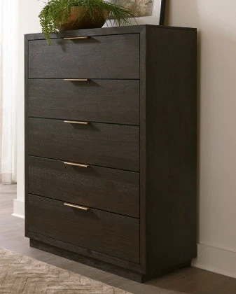 If you find that sleek and simple does the trick, we think youโll agree: this chest of drawers has the look perfected. Always on trend espresso-tone finish and clean lines ensure an aesthetic that never goes out of style. Five drawers generously accommodate your wardrobe needs. Picture frame moulding and goldtone pulls are on the cutting edge of cool.