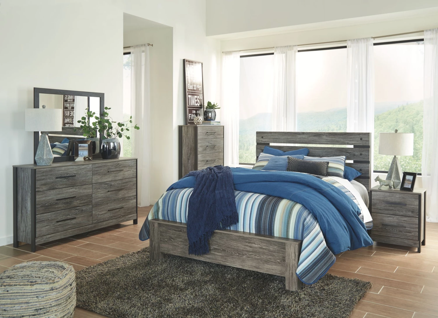 Rustic warm gray finish over replicated Oak grain accented with dark charcoal finish over replicated Oak grain. Sleek contemporary handle in a dark gunmetal finish. Cases feature recessed side panels for a contemporary look. Headboards are designed with an open slat design. Side roller glides for smooth operating drawers. Drawer interiors lined with a faux linen laminate for a clean finished look. Slim USB charger located on the back of the night stand tops. Queen (57) and King (58) headboards can attach to a bolt-on metal bed frame B100-31 or B100-66 respectively.