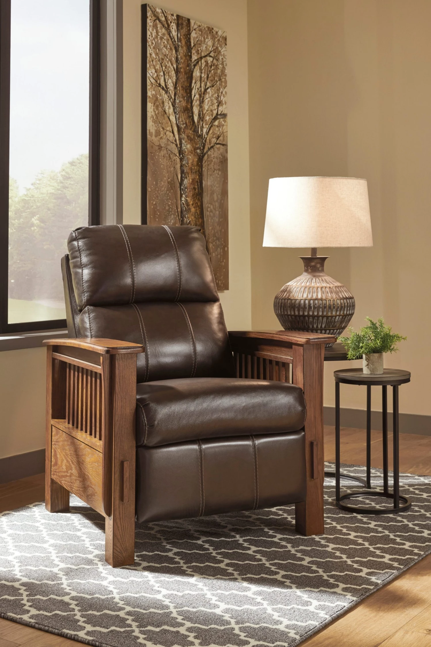 For those on a mission to recline in high style this high-leg recliner foots the bill. Have the pleasure of reclining without the distraction of a lever or knob. Ruggedly handsome—with Mission-style slats replicated through-tenon joints and bustle-back plushness—this upholstered piece masters the art of high design. Rich dark leather throughout the seating area gives a luxurious feel at an affordable price.