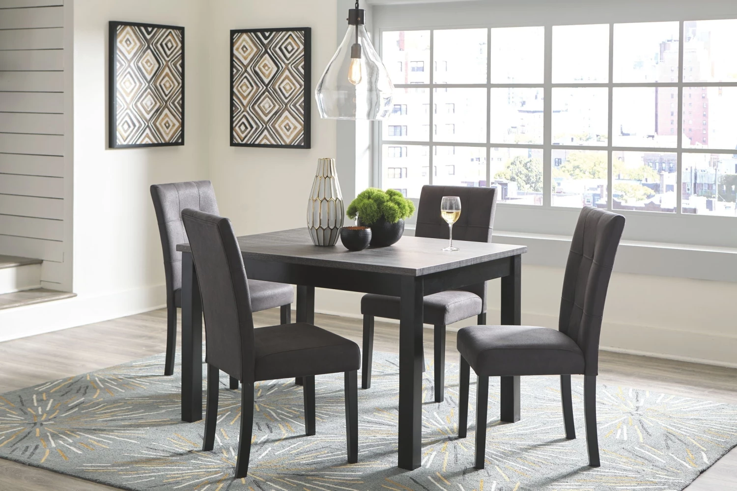 Crafted with a durable melamine surface, this dining set delivers high style with substance. Replicated wood grain top in dark charcoal raises the bar on casually cool dining. Sleek yet sturdy legs in a matte black finish heighten the contemporary appeal. Add the comfort of cushioned bar stools covered in a textured faux leather upholstery and you’ll find plenty of reasons to linger a little longer at mealtime.