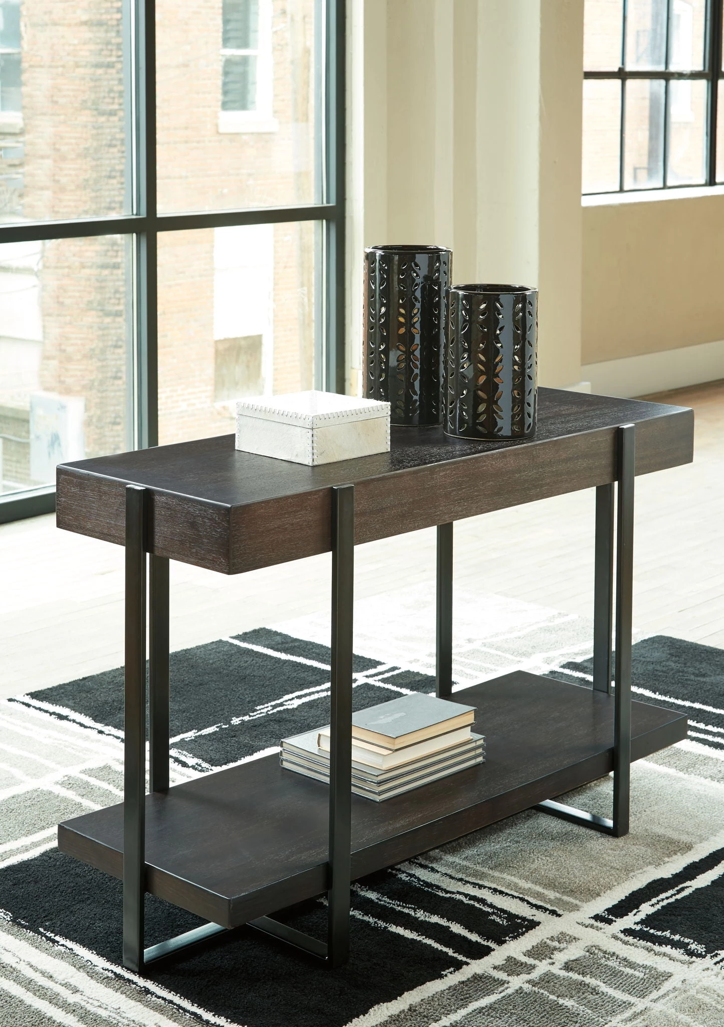 Pairing a thick slab-style top crafted of veneer and engineered wood with a linear metal base, this sofa table is an achievement in urban-contemporary design. The aesthetic might be ultra cool, but a dark brown finish with wire-brushed texturing keeps the feel warm and inviting.