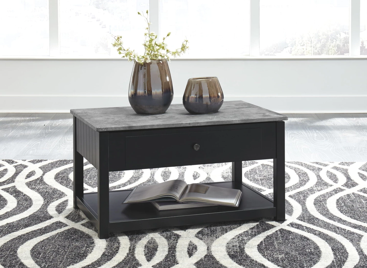Pairing a faux marble top in gray with a brilliant black base, this lift top table makes a simply striking statement. A generously sized drawer adds to the form and functionality. Optional casters provide welcome flexibility.