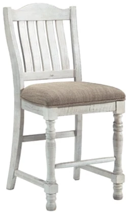 Have your fill of modern farmhouse style with this upholstered dining chair. Distressed vintage white finish is utterly charming. Bent slat back design and cushioned upholstered seat with woven oatmeal-tone fabric cater with beauty and comfort.