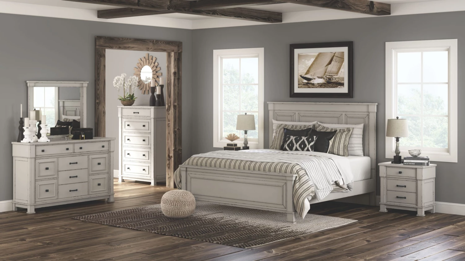 Relaxed antique chipped white finish. Sturdy silhouettes with thick tops and bold pilasters. Rubbed dark metal hardware adds sophisticated contrast. Drawers feature sanded and sealed interiors and ball bearing side glides. Night stand features AC power supply with two USB ports for conveniently charging devices. Panel headboard and footboard with matching crown mouldings.