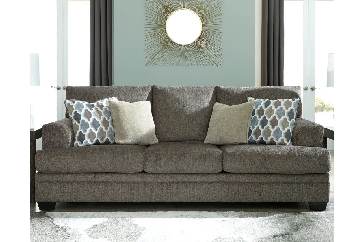 The contemporary Dorsten sofa has comfort written all over it. From the plush cushions to the textured gray fabric, itβs a total winner for relaxation. Designer throw pillows in blue, brown and tan complement the richly neutral upholstery.