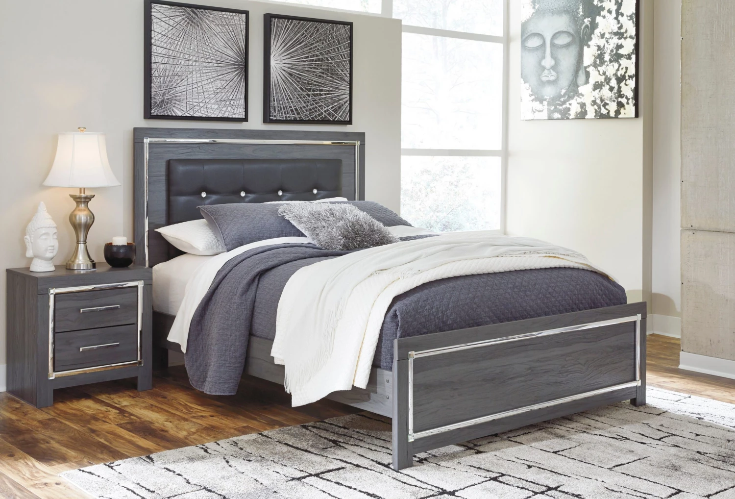 Reminiscent of Hollywood glamour of yesteryear this queen/full panel headboard interprets luxury in a decidedly modern way. Sumptuous details include button-tufted Upholstered faceted faux crystals and chrome-tone accents beautifully lit by LED lights enhanced with remote-controlled settings for color and brightness.