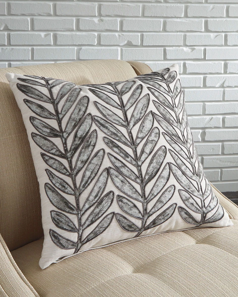 Blending soothing shades of taupe and silver with an artful leaf design, this toss pillow is a natural fit. Cord outlining gives this earthy-elegant pillow a hint of cool texture.