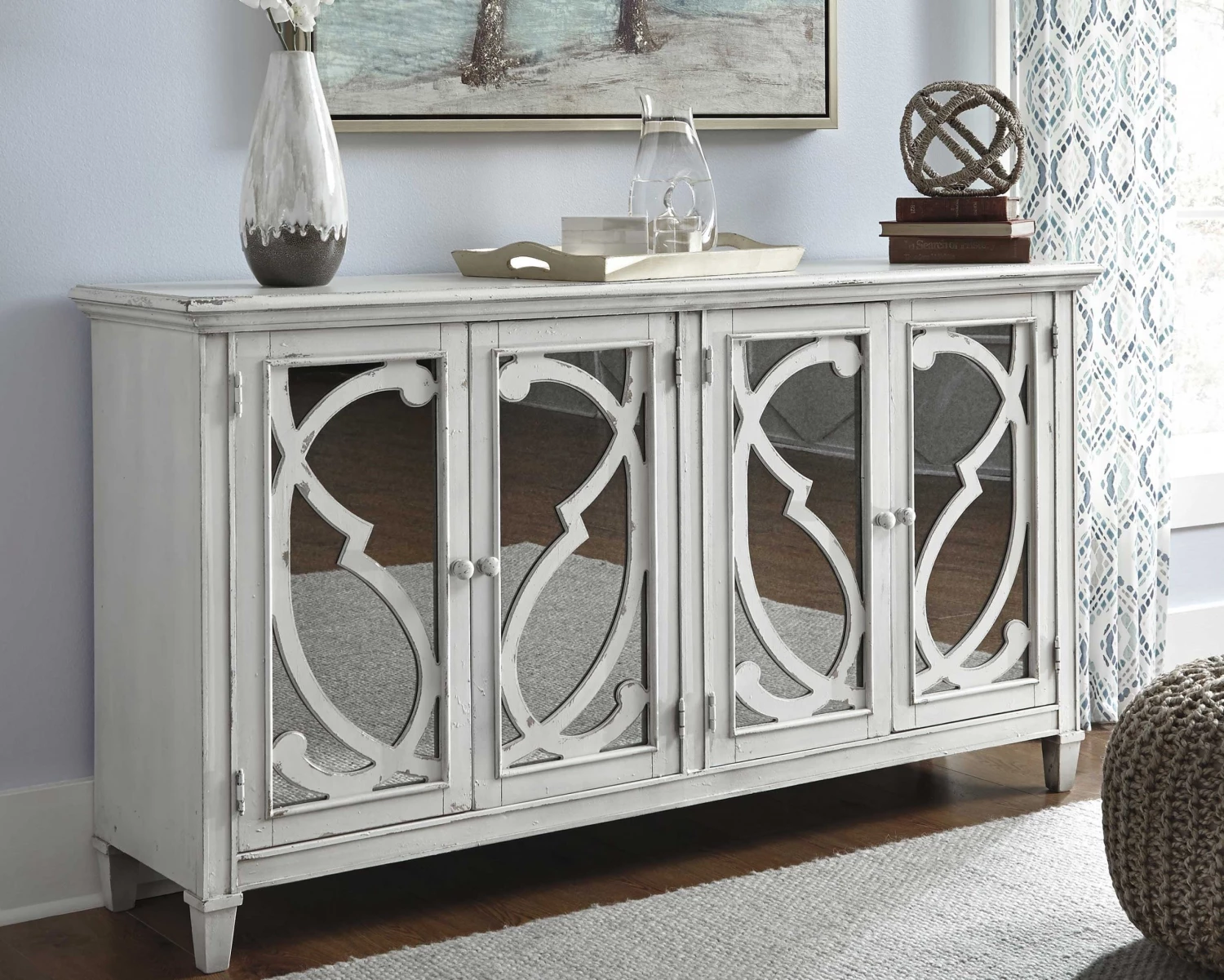 With its distressed finish made to look like fabulously faded antique white paint, this cabinet is an eclectic piece that beautifully suits so many spaces, including the dining room, living room and entryway. Ornately scrolled filigree front doors with mirrored glass inlays are a reflection of your fine taste and stylish flair. Adjustable shelving enhances its form and function.