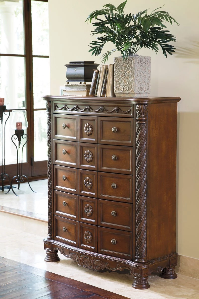A rich traditional design and exquisite details come together to create the ultimate in the grand style of the “North Shore” bedroom collection. The opulent brown color flows beautifully over the decorative pilasters and ornate detailed appliques to create a rich elegant atmosphere to any home environment. With a serpentine shaped design and inlay stone veneer tops, this furniture collection takes traditional style to the next level. Transform your bedroom with the rich style of the “North Shore” bedroom collection.
