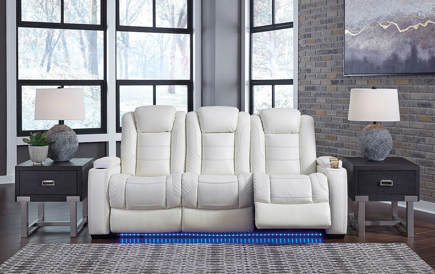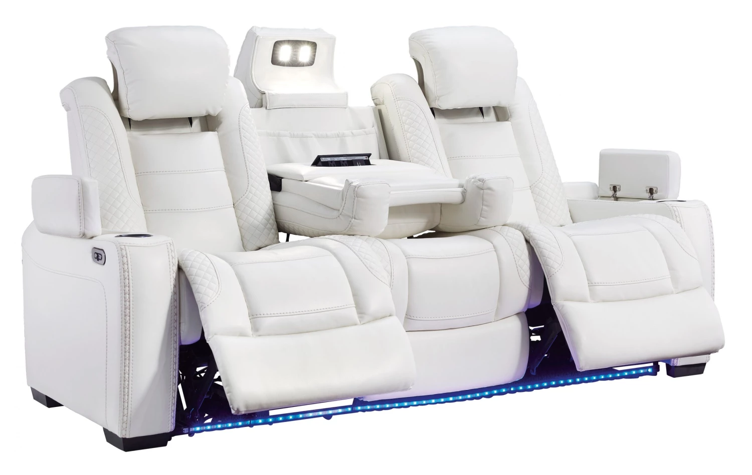 This power reclining sofa takes its cue from luxury automobiles with lattice and crosshatch stitching for a richly tailored aesthetic that gives you plenty of reasons to celebrate. Sumptuously padded cushions and crisp white faux leather upholstery add to the indulgence. When itβs time to rev up the action the dual reclining bucket seats (middle seat stays stationary) Easy Viewβ’ power adjustable headrests LED accent lighting and center seat that folds down into a table keep you in the driverβs seat.