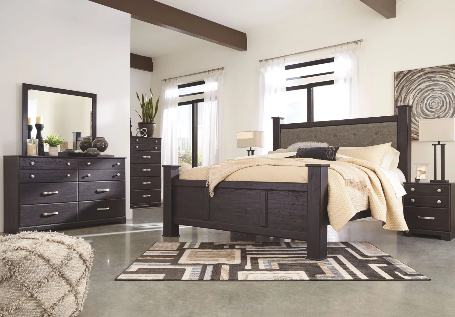 Ashley Reylow Dark Brown Queen Poster Bed W/ Dresser Mirror & Nightstand Bedroom
