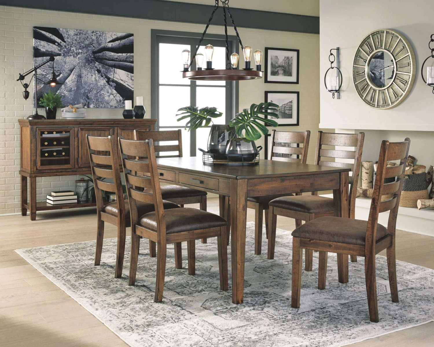 Traditional lodge styling with a glazed natural Acacia wood finish. Constructed with Acacia solids and veneers. Large counter height gathering table features storage base with door access from either side. Smaller scale dining table features side drawer storage in the aprons for small space dining solutions. Sideboard features dual door cabinet and glass door cabinet with a set of reversible wine rack shelves for more storage options. Barstools are constructed with solid Acacia wood frames and soft faux leather upholstery set with nail trim.