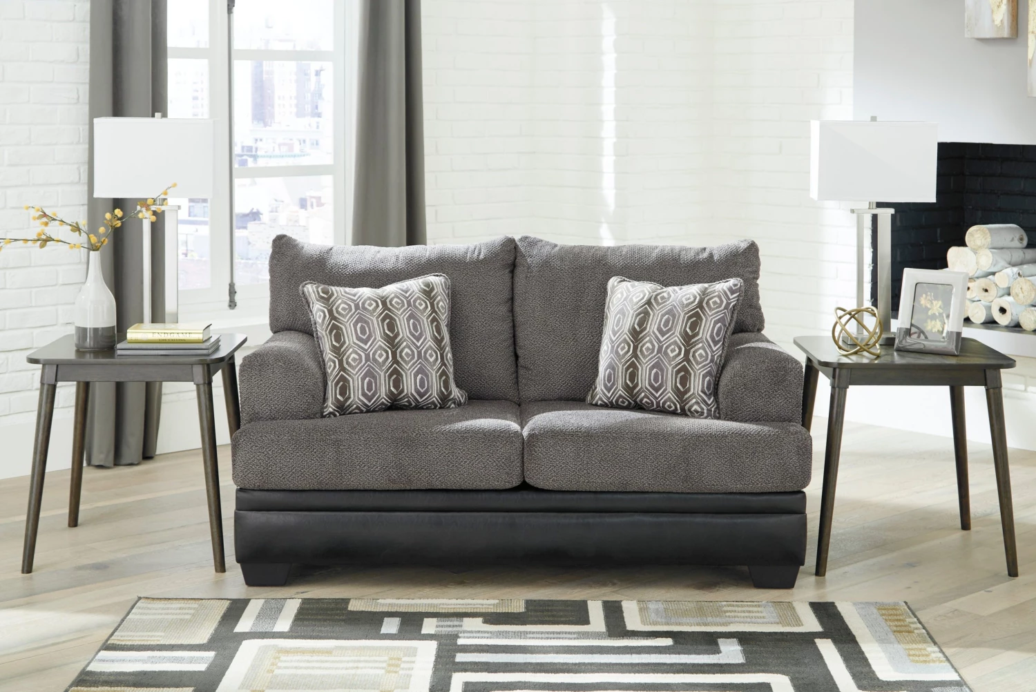 Comfort is inevitable with this loveseat. Handsome profile is teeming with chenille softness. Smoky gray textured cushions meet black faux leather for a quality look. Throw pillows with a trendsetting geometric pattern season this sofa with extra style flavor.
