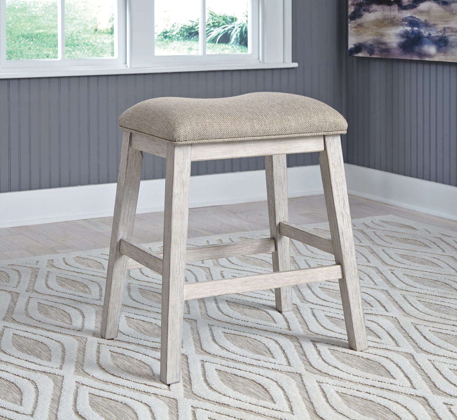 This upholstered stool invites you to raise the bar on small space living. An inspired choice for coastal chic or modern farmhouse settings, this comfortably cushioned stool sports a grayish white finish with rub-through effect for timeworn appeal.