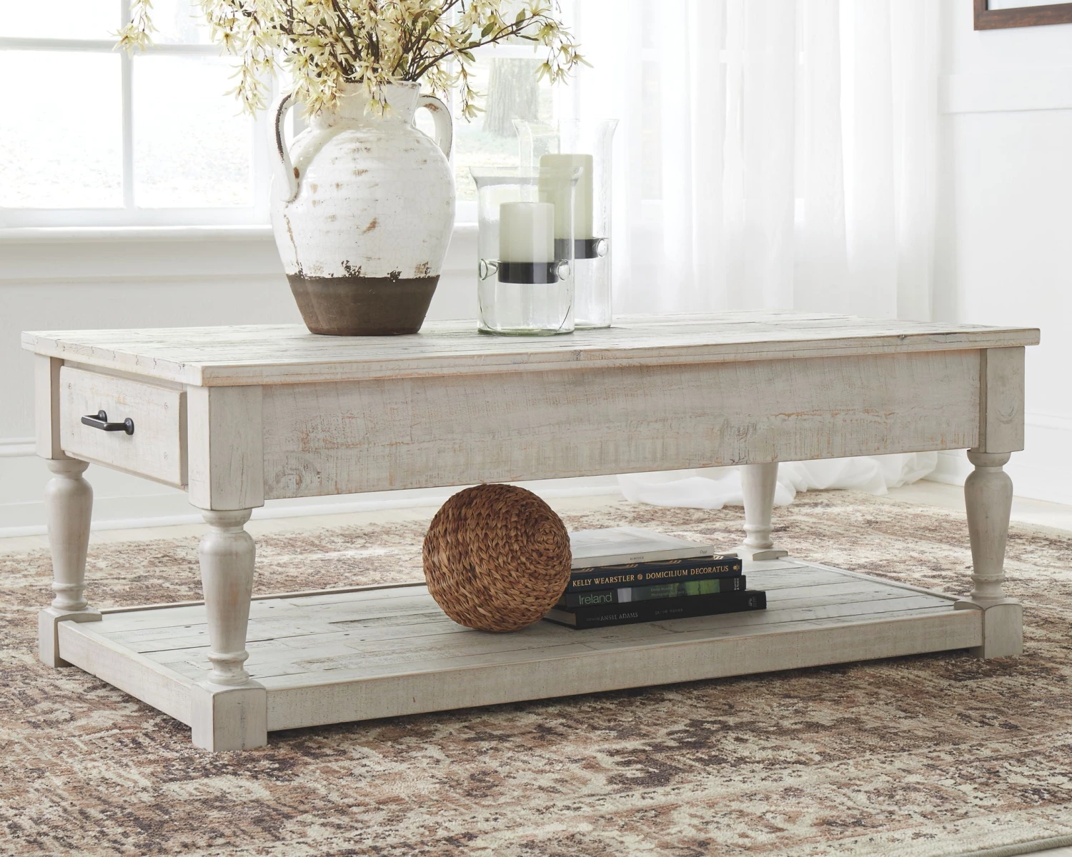 Made with pine solids with textured surfaces. Finished in a white textural color that highlights the reclaimed feel of the wood tones and nail holes. Drawers are fully finished with dovetail construction and ball bearing guides. Wrought looking bar pull hardware in an industrial silver/bronze color finish. T782-21 cocktail table has a thick tufted cushion top in a linen look cover. T782-4 has three drawers and lower open shelf for display.