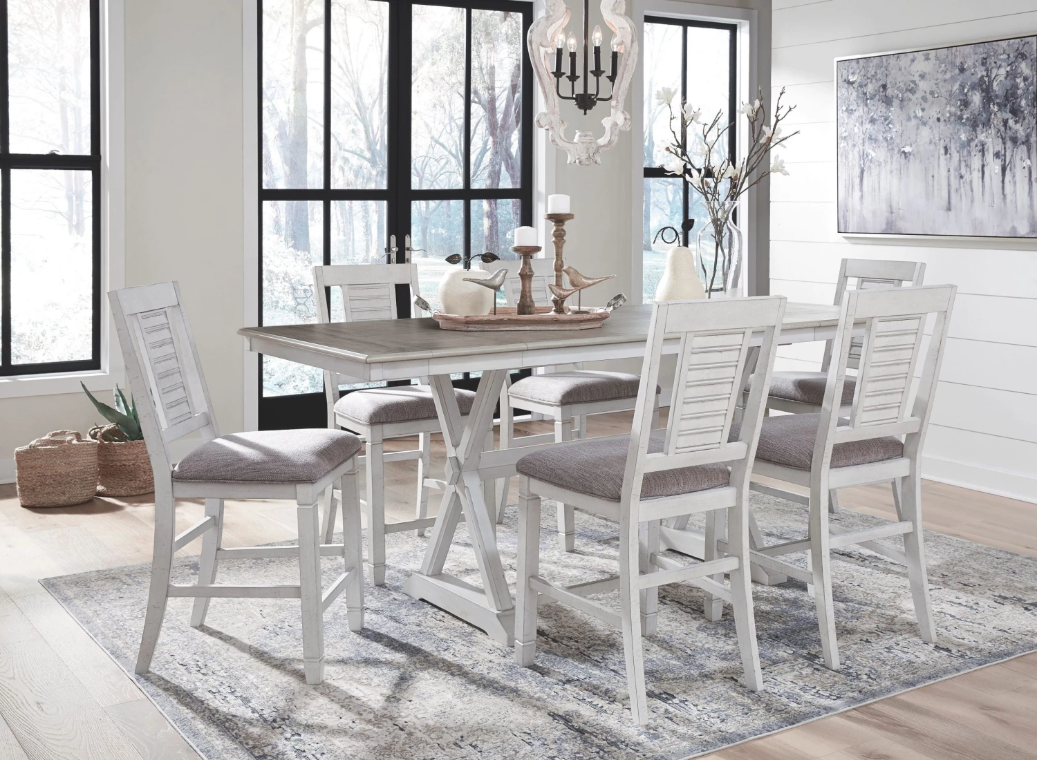 Traditional country cottage styling. Trend right two tone finish with an antique white body and correlating antiqued chipped paint tops. Double extension table top set on a trend right cross-buck trestle base. Counter height barstool features a solid wood frame with louvered back rest and cushioned seat with a textured polyester fabric. Matching backless bench.