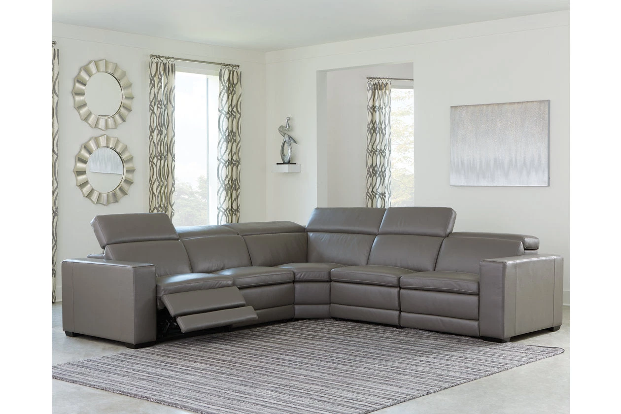Truly putting high design into recline, the Texline sectional with genuine leather seating area proves that just because you’re a recliner doesn’t mean you have to look like one. Deceptively beautiful, its ultra clean-lined aesthetic is as cool and contemporary as they come. Low-profile back has a super swank look. When you need more support for your head and neck, the press of a button engages the Easy View™ power adjustable headrest, designed to let you lean back and still have a primo view of the TV. The zero wall design requires minimal space between wall and chair back, and indulgent pillow top seating gives an added layer of comfort.