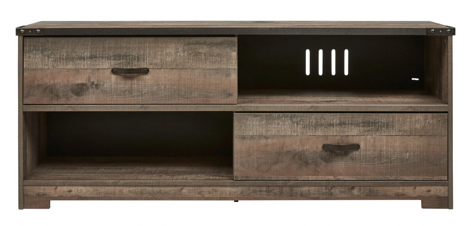 Entertain a rugged yet refined sense of style with this TV stand. Rustic finish and plank-style details pay homage to reclaimed barn wood, while faux metal banding with nailhead accents infuses a touch of industrial cool. Ultra clean lines ensure a look that can go from the country to the city and feel equally at home.