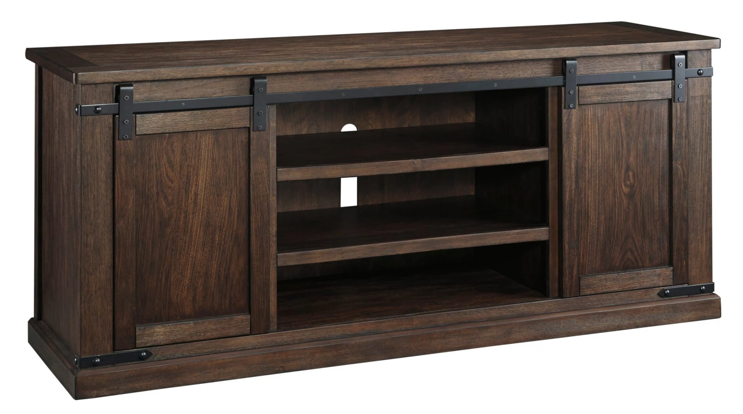 Add a big touch of country style to your living area with this extra large 70″ TV stand. It’s visually appealing with the flexibility you need. Adjustable end shelves offer lots of storage, while the two stationary middle shelves are roomy for housing media equipment. Two sliding barn doors can easily be positioned as you desire. For an uncluttered look, slide the doors over the two ends and use those areas for hidden storage—what a deal.