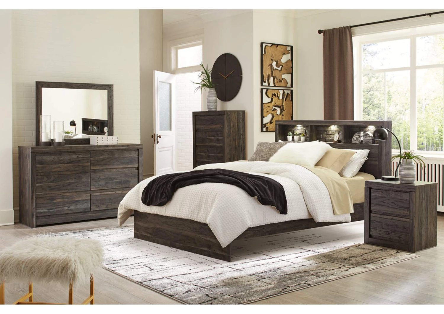 Rustic charcoal finish over replicated acacia woodgrain with authentic touch. Inset and hardware-less drawers. Cases feature framed front and pilasters. Modern bookcase headboards (65 69) include warm LED lighting and a textured back splash. Side roller glides for smooth operating drawers. Drawer interiors are lined with a replicated linen design for a clean finished look. Both USB and Qi wireless charging options are provided with the night stands. Queen (65) and king (69) bookcase headboards can attach to a bolt-on metal bed frame B100-21 B100-31 or B100-66 respectively. Mirror (36) has the versatility to be mounted on dresser or wall horizontally or vertically.