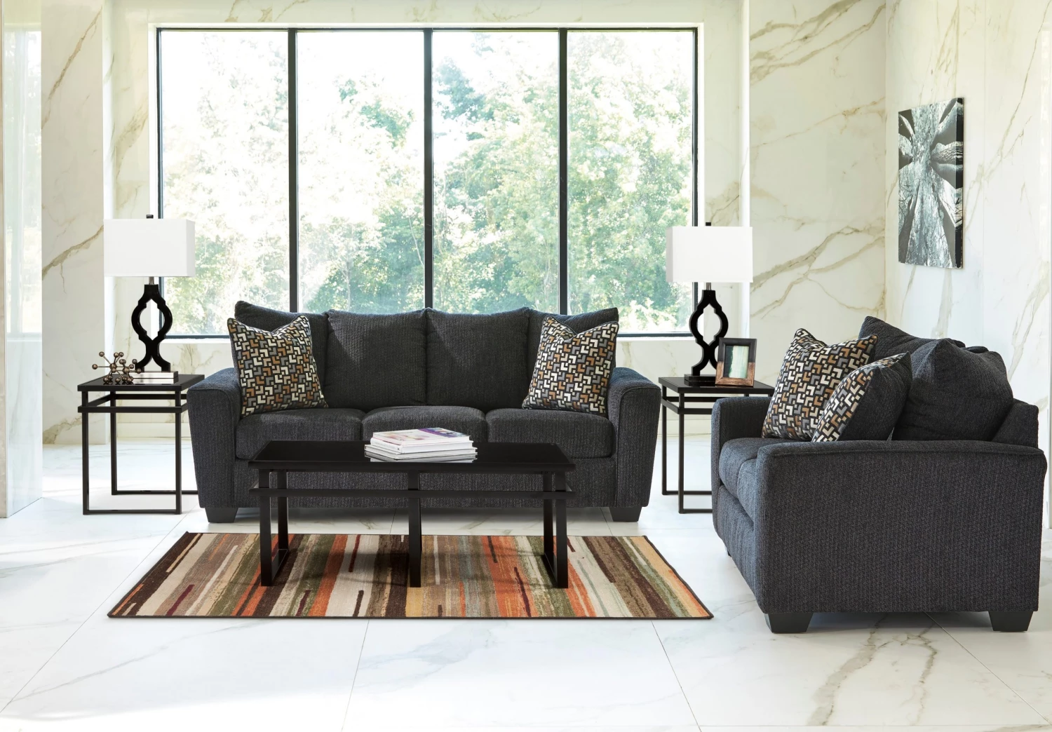 Align your living space with a clean-lined, highly contemporary look that doesn’t overlook your lust for cozy comfort. This stylish sofa’s flared profile, track arms and boxed cushions are beautifully on point. Chunky chenille upholstery is loaded with visual and tactile texture. Sofa dimensions: 38″D x 40″H x 88″W Loveseat dimensions: 38″D x 40″H x 65″W
