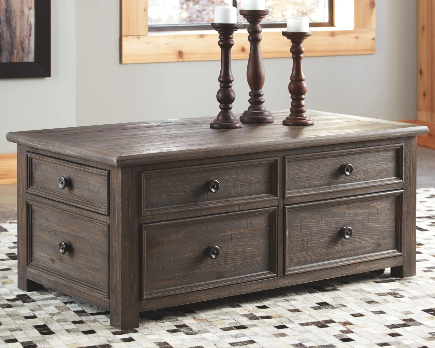 Inspired by heavy and hearty lodge-style furnishings from days gone by, this lift top coffee table brings the past brilliantly into the present. Distinctive details include robust mouldings, raised drawer fronts for rich dimension and a distressed aged pine color finish with light wire-brushed texture thatβs pure artistry. The tableβs spring lift topβperfect for impromptu meals and laptop workβmakes this yesteryear-inspired piece made for the here and now.