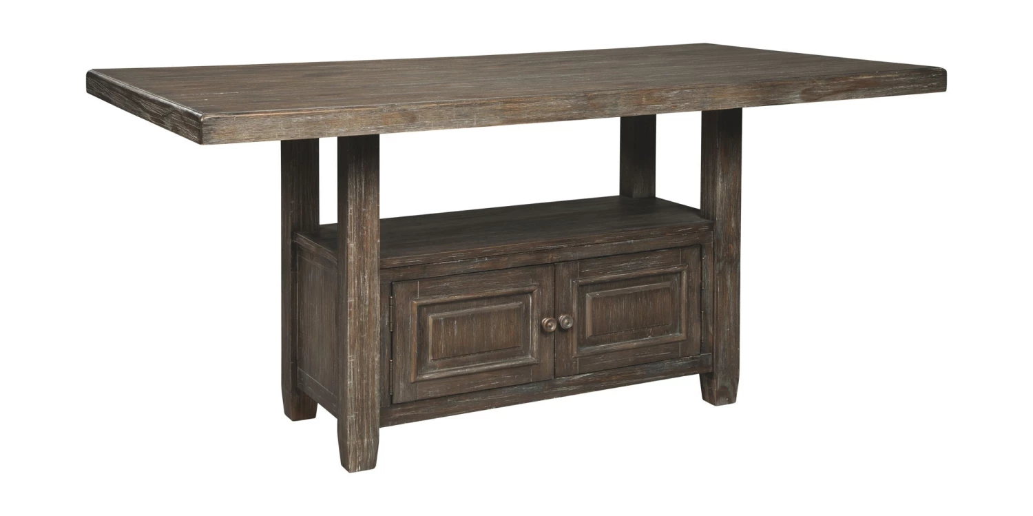 Inspired by heavy and hearty lodge-style furnishings from days gone by, this dining room counter height table brings the past brilliantly into the present. Enhancing the robust look and feel: a thick edge tabletop set atop a sturdy storage base. Enticing with a distressed aged pine color finish with light wire-brushed texture, this counter height table is reserved for those who appreciate furniture with great presence.