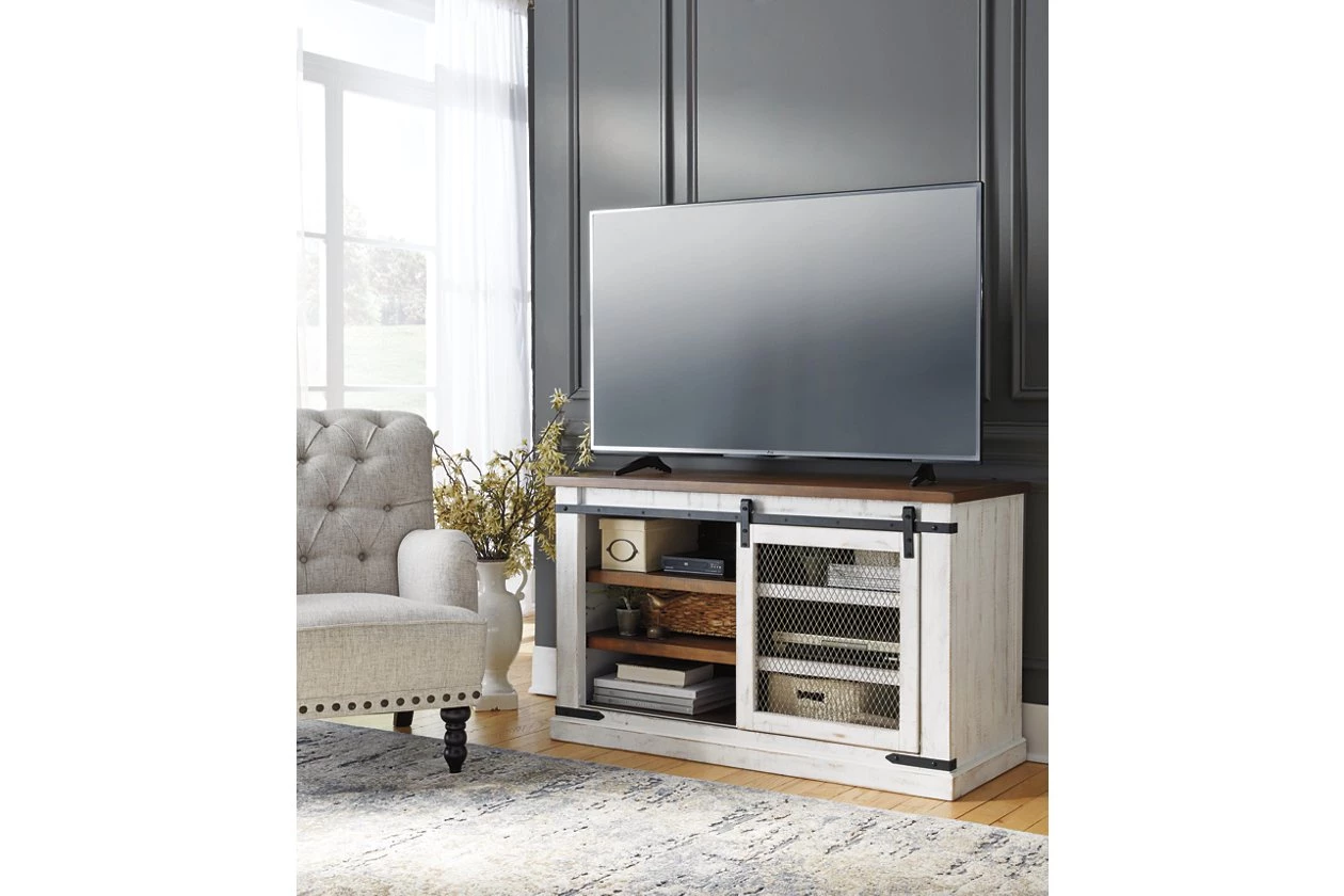 Double take. Sporting a two-tone finish that pairs a distressed vintage white with an aged natural pine-color top and shelves, the Wystfield TV stand elevates the art of rustic farmhouse living. Enhancing its charm: a sliding barn door with inset metal grill and antiqued gray industrial hardware.