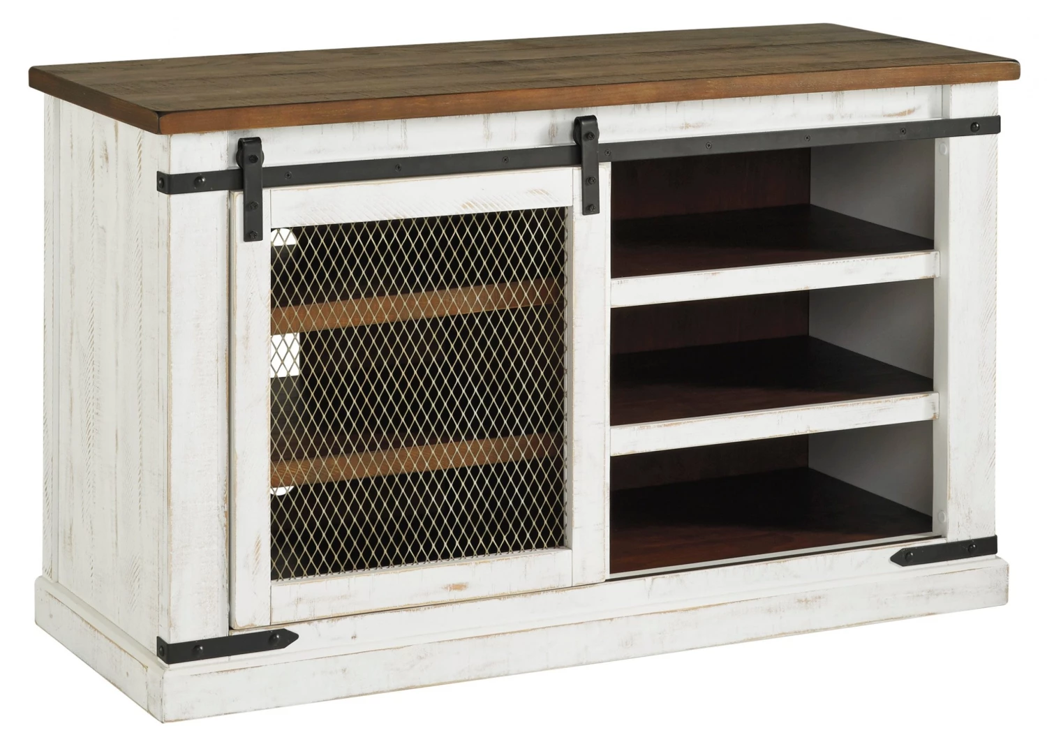 Double take. Sporting a two-tone finish that pairs a distressed vintage white with an aged natural pine-color top and shelves, this TV stand elevates the art of rustic farmhouse living. Enhancing its charm: a sliding barn door with inset metal grill and antiqued gray industrial hardware.