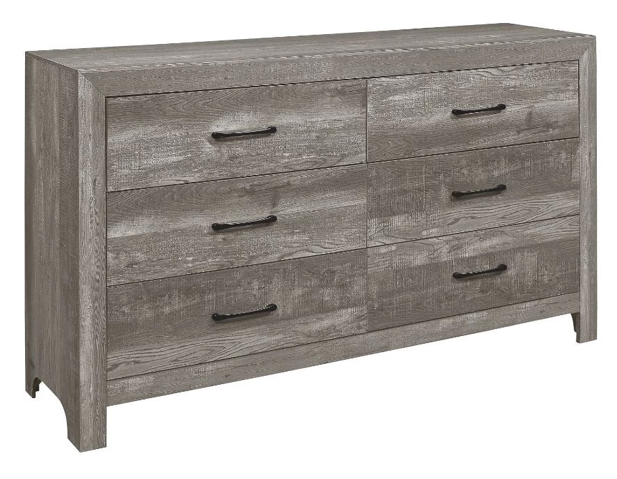 Modern lines and rustic styling are paired to create the look of the Corbin Collection. The 3D printed paper veneer’s texture is highlighted by a gray finish for a realistic wood look. Providing complementing contrast, the drawer fronts of the dresser, chest and nightstand feature black metal hardware. Subtle framing defines the profile of the headboard and footboard, further lending to the unfettered design of the collection.