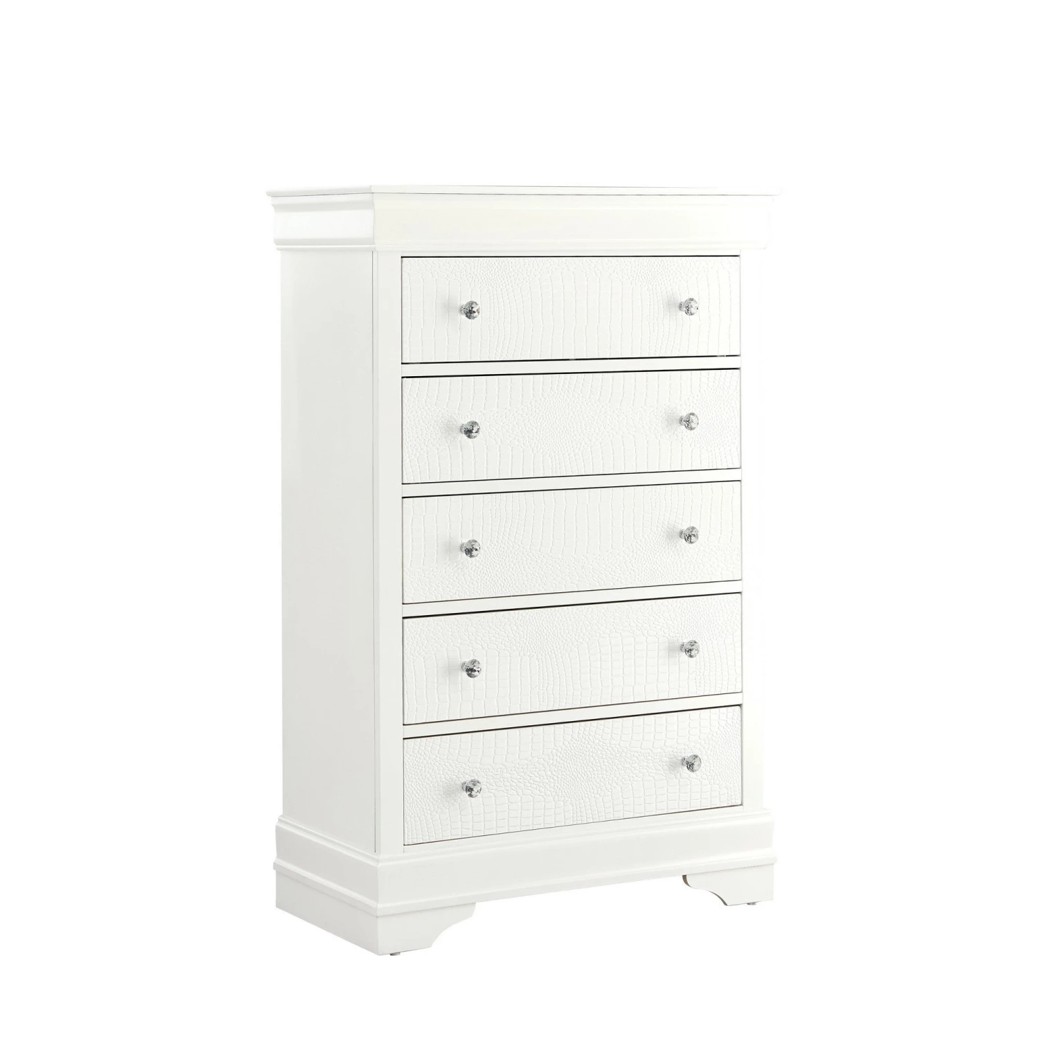 Your sleeping space should dazzle with the Pompei Chest. Featuring spacious drawers, crystal inspired hardware, and textured detail. This chest is sure to provide an unexpected luxe look and feel in your bedroom.