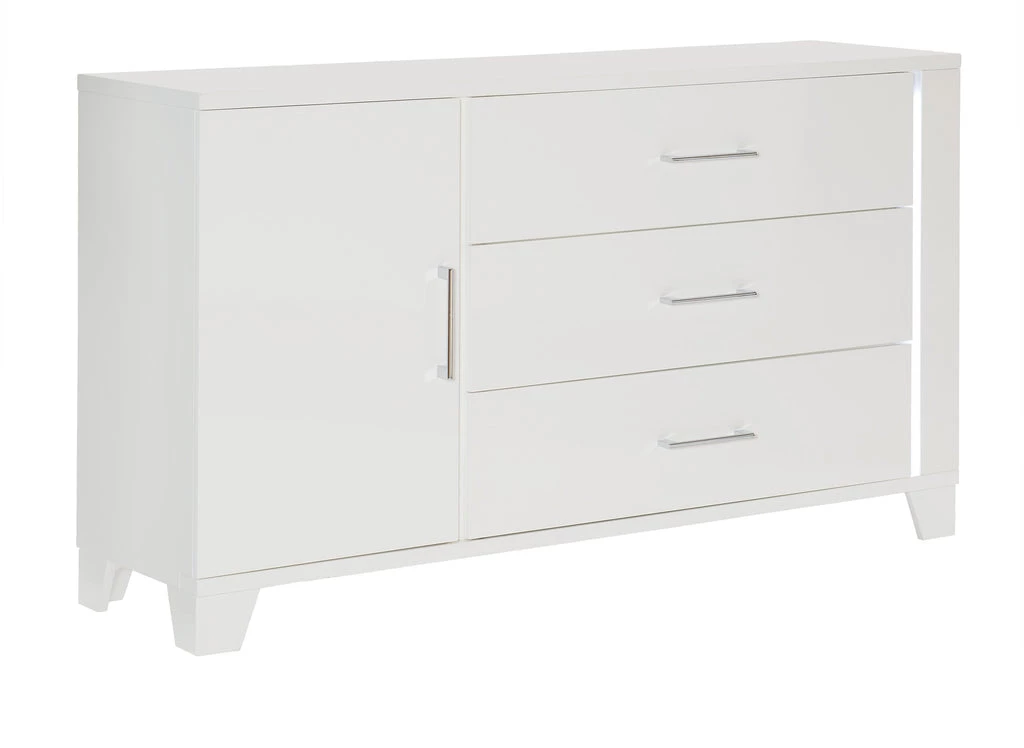 The visually stunning Keren Collection is a modern study on line and light. LED enhances the front side of each piece and top rail of the bed. Providing additional eye-catching drama is the white opalescent bi-cast vinyl headboard shimmering in the glow of the LED light. The door dresser provides ample space for storage alongside the nightstand and chest.